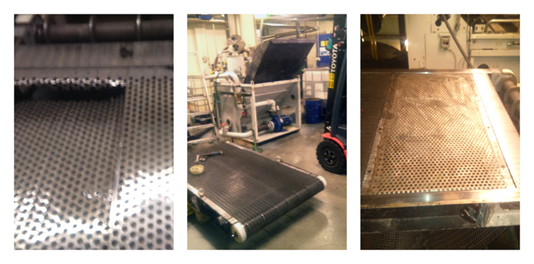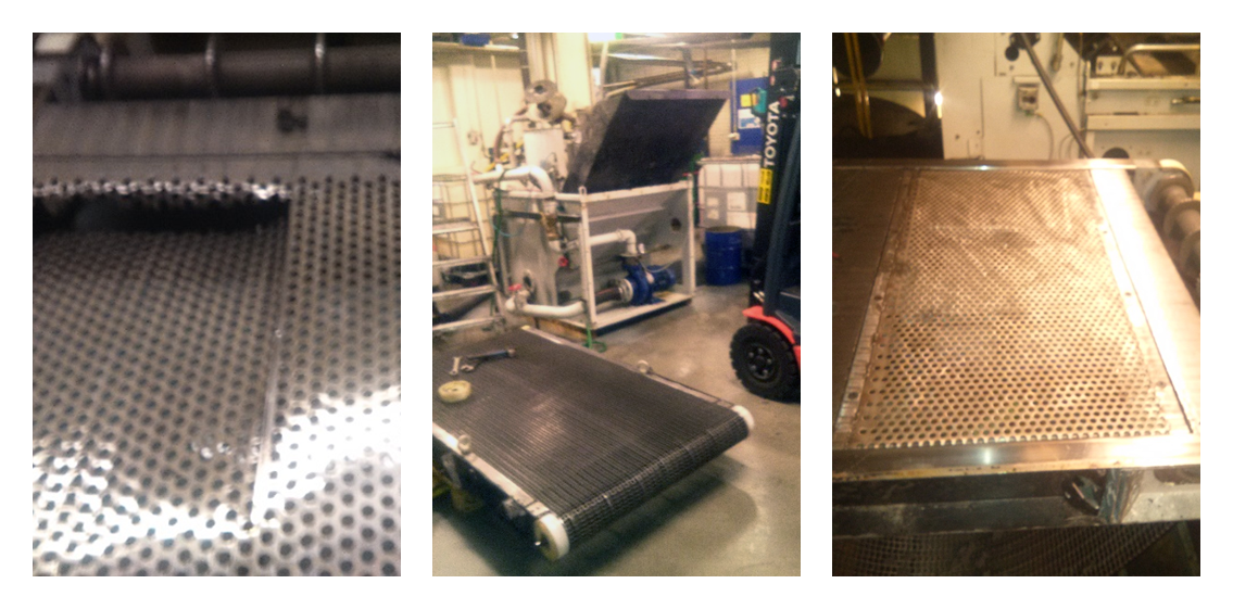 Här har kund haft problem med hög åtgång på filterduk. Felet visade sig vara den så kallade hålplåten var så sliten att den separerat, ny plåt monteras och filtret blev som nytt.